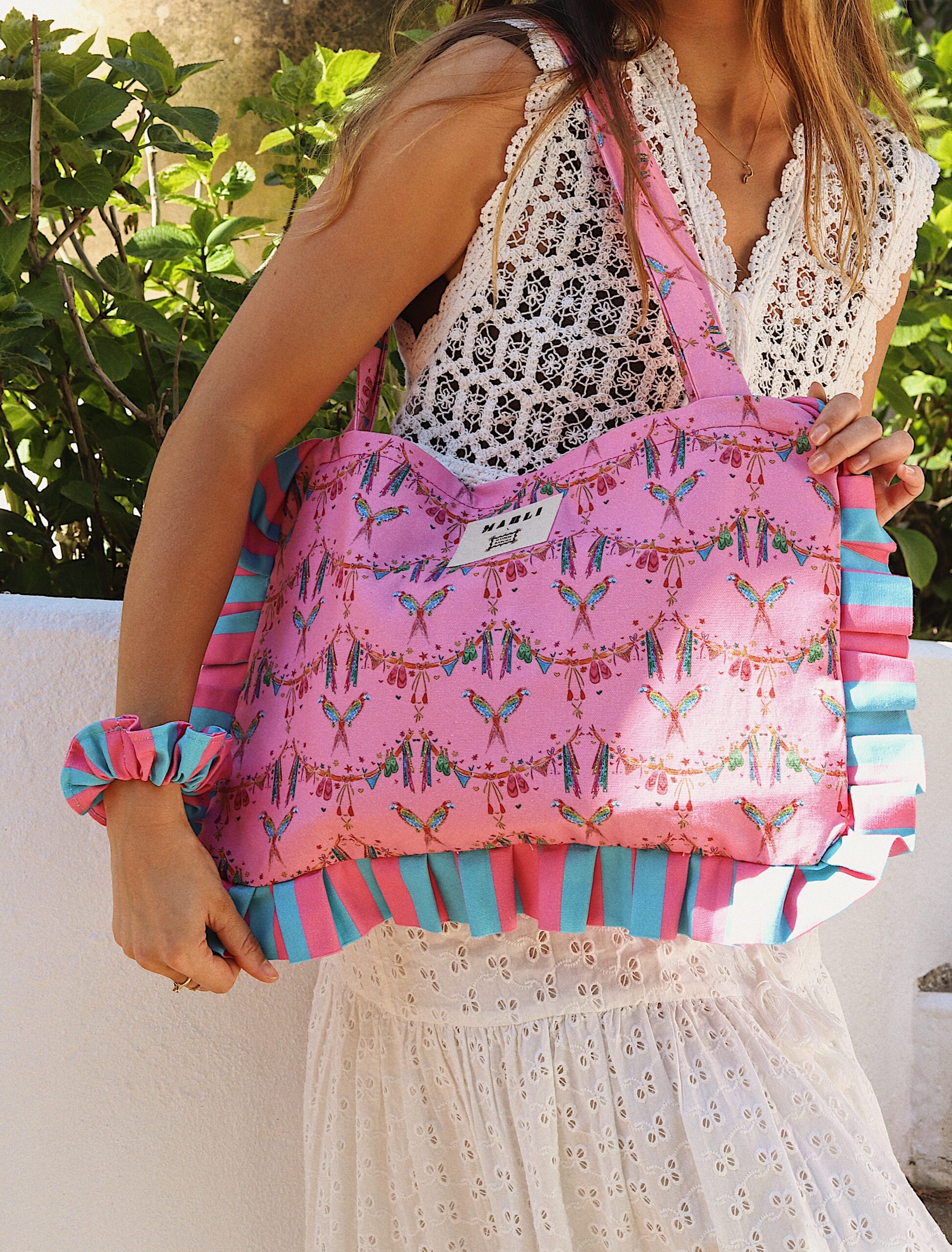 Cabas froufrou Tiago – Motif Bikini et Perroquets fond rose