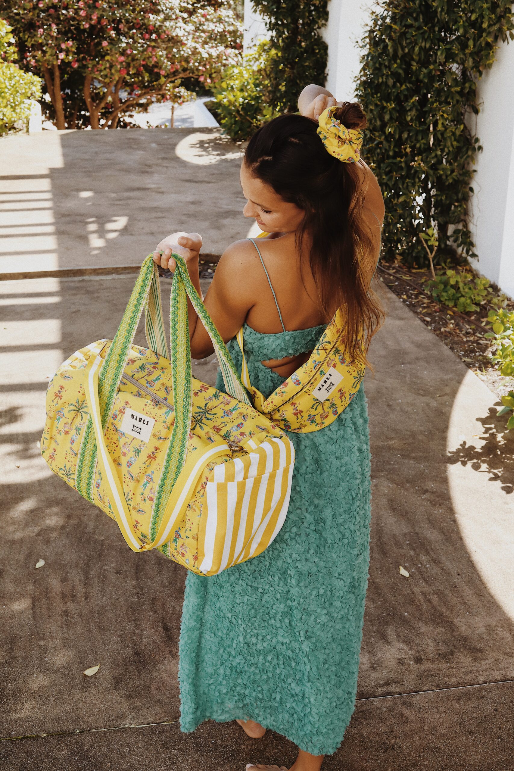 Fabriquée à la main en France, cette pièce est issue de notre collaboration exclusive avec Maison Datcha, inspirée du Brésil. Une scène en mouvement. Danseuses, musiciens, rythme et énergie se déploient sur un fond jaune lumineux. Cet imprimé a été créé spécialement pour cette collection capsule : vivant et chaleureux, qui capture l’atmosphère festive et vibrante du Brésil.