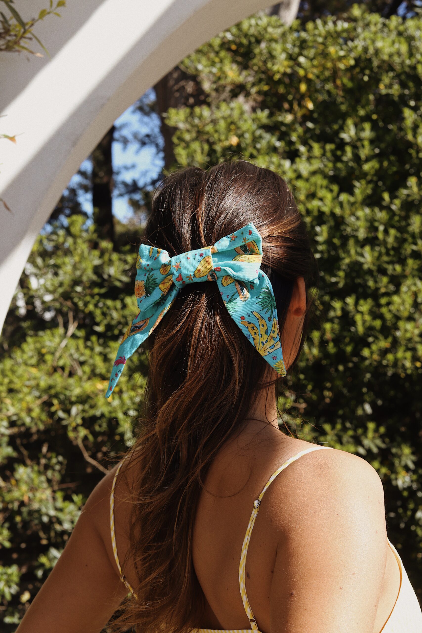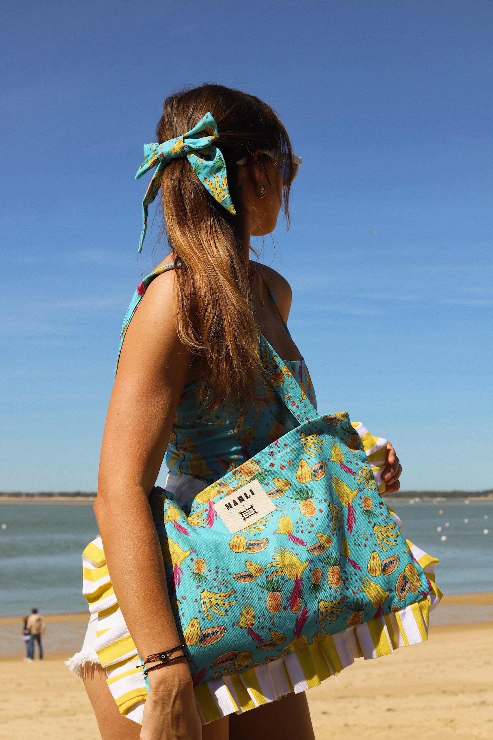 Fabriquée à la main en France, cette pièce est issue de notre collaboration exclusive avec Maison Datcha, inspirée du Brésil. Une farandole joyeuse de fruits tropicaux, comme en mouvement. Ananas, papayes et bananes s’entrelacent sur un fond turquoise éclatant. Un imprimé spontané, vivant, presque gourmand.