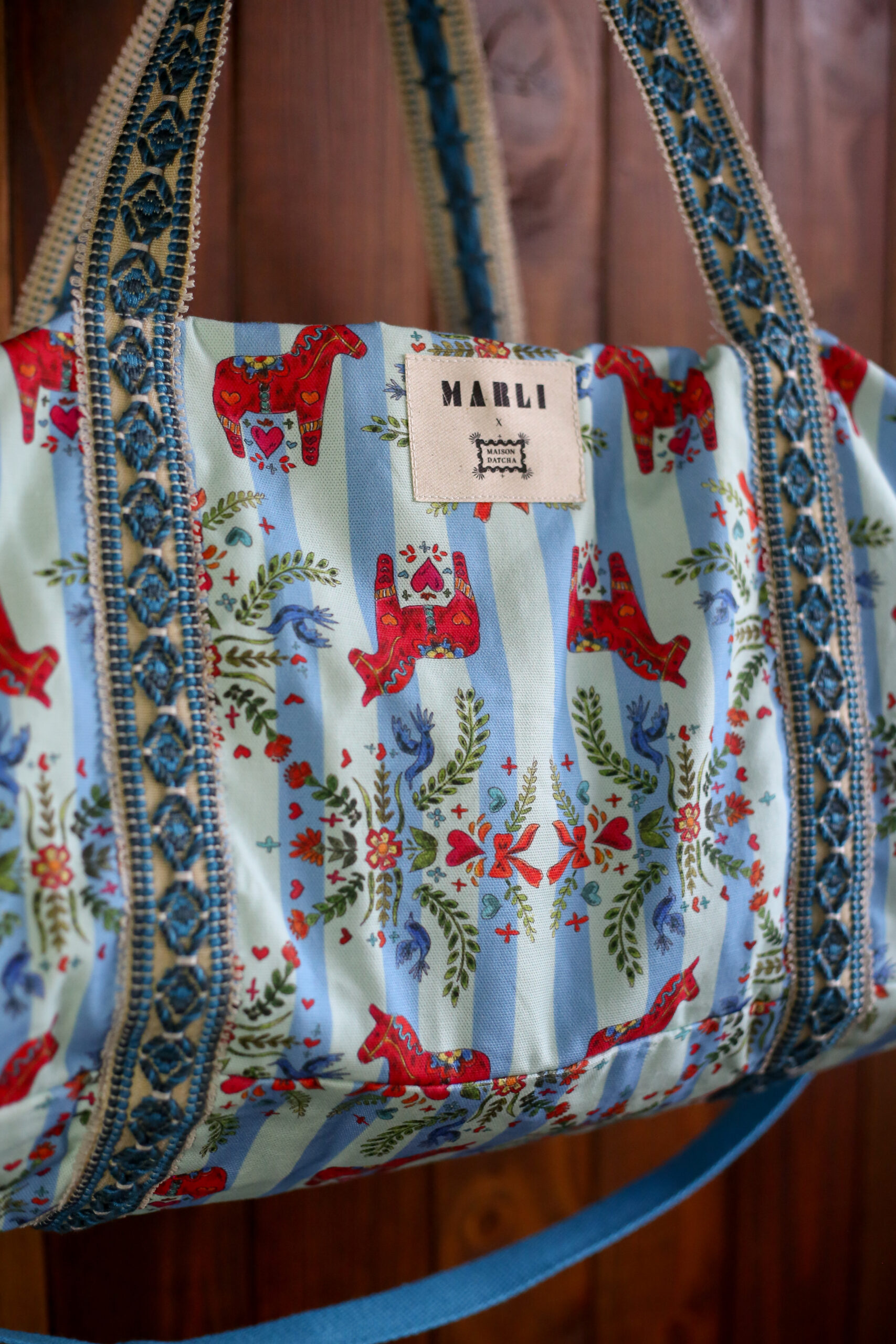 Pourquoi on l’aime ? Notre sac polochon maxi sera votre nouvel indispensable pour vos escapades. Équipé de 3 poches intérieures ainsi que 2 rangements extérieurs sur le côté. À la fois chic et pratique avec sa fermeture zippée, il peut se porter à l’épaule ou en bandoulière. Notre sac polochon maxi sera votre idéal compagnon au quotidien pour les mamans, comme le week-end. Fabriquée à la main en France, ce cabas unique est confectionnée à partir des tissus issus de notre collaboration exclusive avec Maison Datcha, imaginée autour de l’inspiration hiver slave. Cet imprimé a été créé spécialement pour cette collection capsule. Couleurs vibrantes, motifs floraux et références iconiques au folklore slave (poupées russes, petits chevaux, symboles traditionnels) font de cette pièce un essentiel unique et poétique