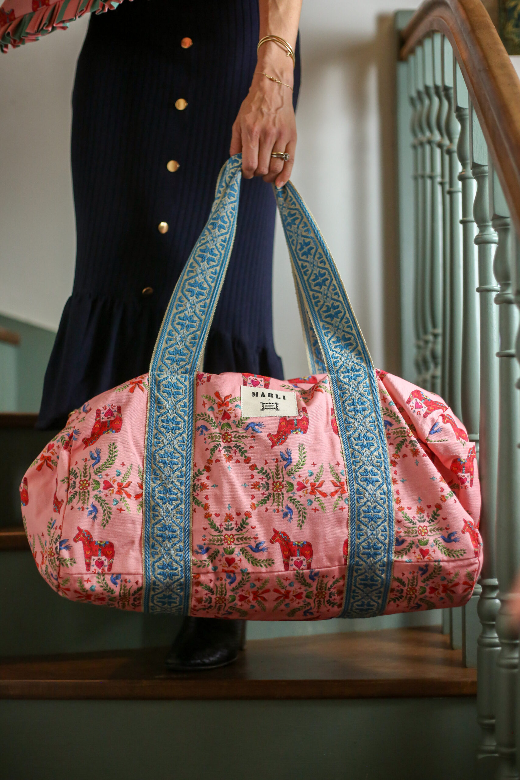 Pourquoi on l’aime ? Notre sac polochon maxi sera votre nouvel indispensable pour vos escapades. Équipé de 3 poches intérieures ainsi que 2 rangements extérieurs sur le côté. À la fois chic et pratique avec sa fermeture zippée, il peut se porter à l’épaule ou en bandoulière. Notre sac polochon maxi sera votre idéal compagnon au quotidien pour les mamans, comme le week-end. Fabriquée à la main en France, ce cabas unique est confectionnée à partir des tissus issus de notre collaboration exclusive avec Maison Datcha, imaginée autour de l’inspiration hiver slave. Cet imprimé a été créé spécialement pour cette collection capsule. Couleurs vibrantes, motifs floraux et références iconiques au folklore slave (poupées russes, petits chevaux, symboles traditionnels) font de cette pièce un essentiel unique et poétique