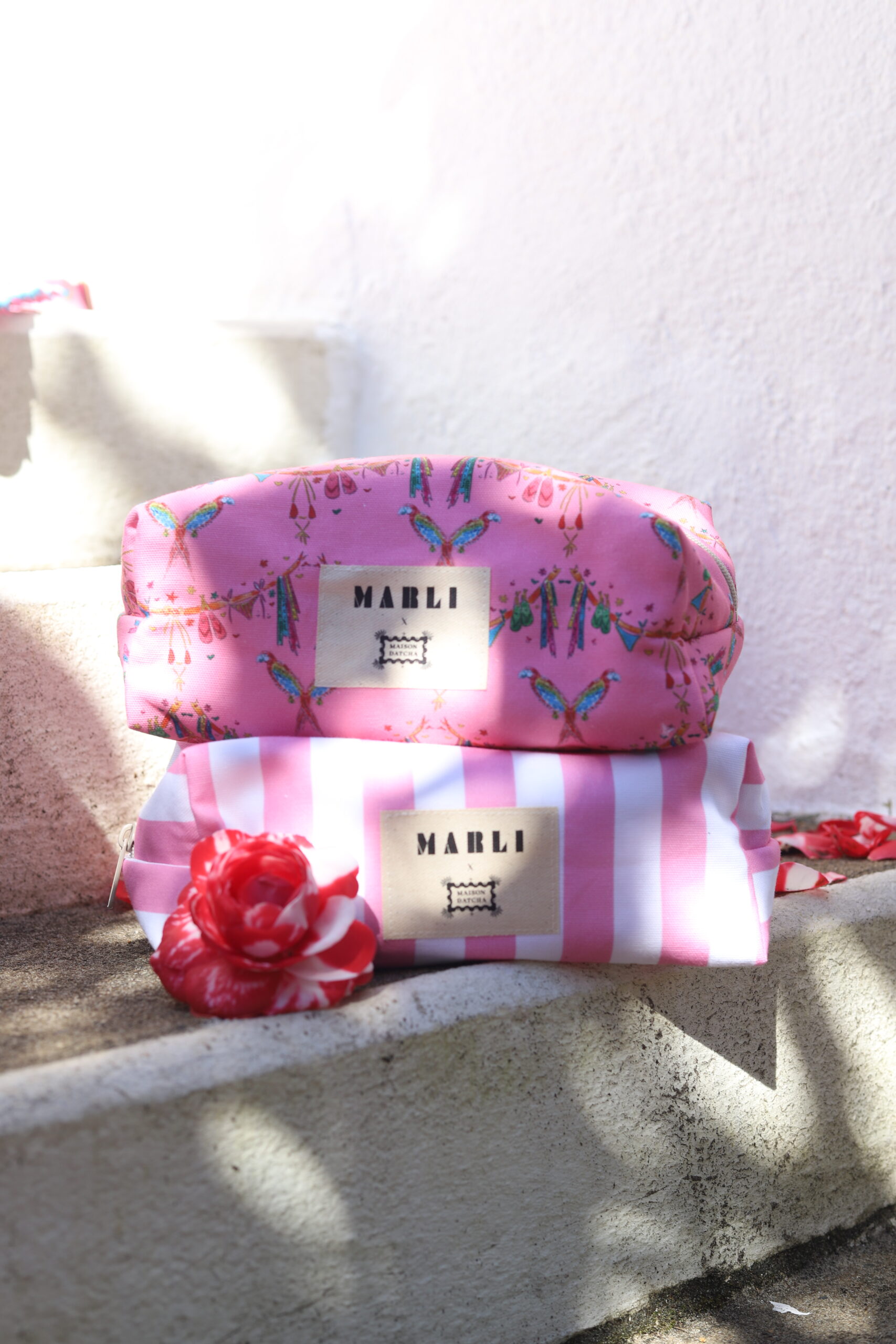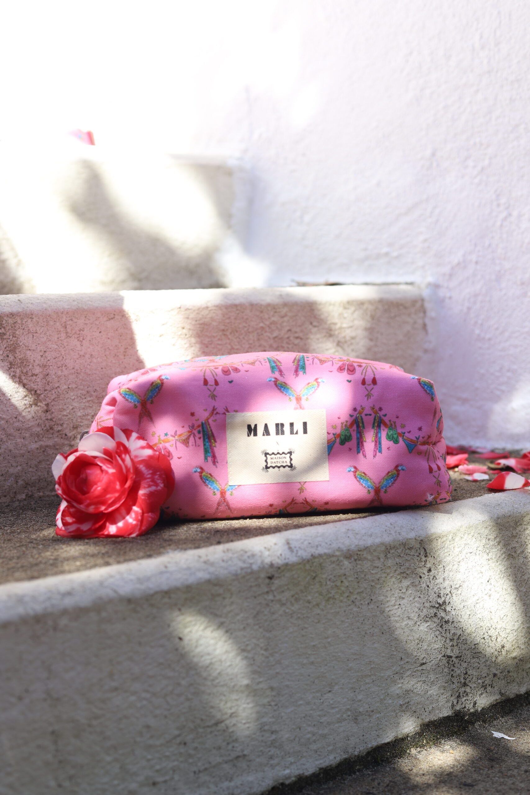 Trousse maxi Helena – Motif Bikini et Perroquets fond rose