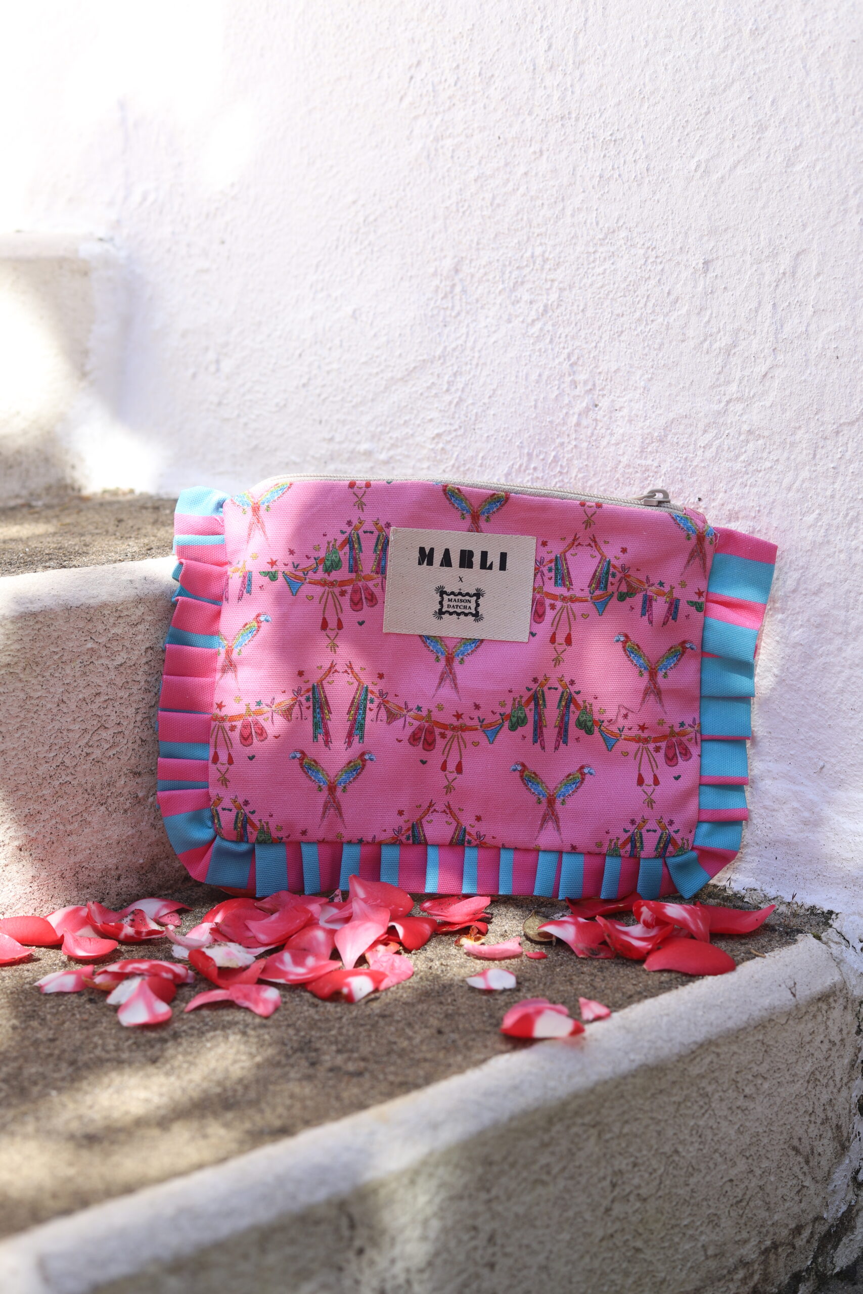 Notre trousse froufrou est issue de notre collaboration exclusive avec Maison Datcha, inspirée du Brésil. Cet imprimé a été créé spécialement pour cette collection capsule. Un imprimé ludique, riche en détails. Bikinis, perroquets, bracelets brésiliens et tongs se dévoilent au fil du regard. Une composition joyeuse et inattendue, pensée comme une scène estivale pleine de clins d’œil.