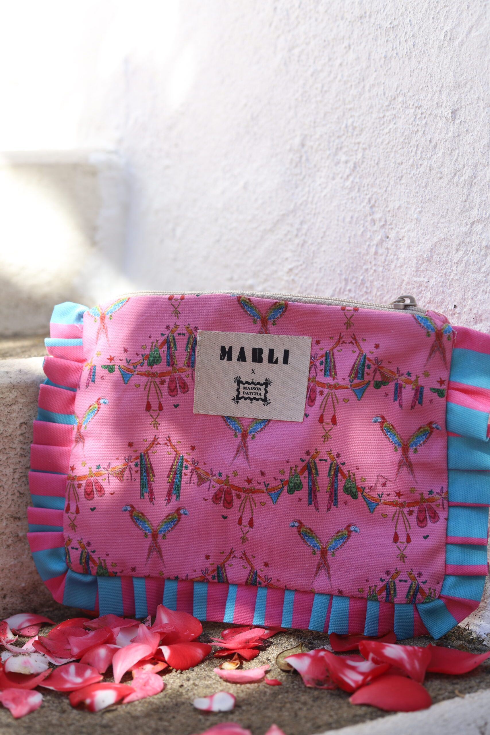 Trousse froufrou Camila – Motif Bikini et Perroquets fond rose